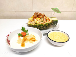 今天我们上了最后一堂烹饪课,今天我们做的是菠萝炒饭,鸡蛋羹和西米露。今天的课也是和往常一样,我们先看了视频,现场示范,然后问问题,好了之后,我就开始去做今天的饭菜了。今天的内容会比上次做的的要简单一点,因为炒饭和鸡蛋羹我都做过,所以说这次也是用到了以前累计的经验。今天我觉得做的格外的好吃,菠萝的味道不会扩散到整盘饭里,让饭酸酸的,鸡蛋羹也是刚刚好,不会太咸或太淡,西米露呢也是一样,很解暑,清凉又可口。这次呢也要感谢各位老师的指导和经验,谢谢你们。