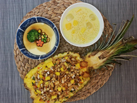 今天我们学做了超级好吃的主食-菠萝炒饭,超有营养的配菜-鸡蛋羹,还有超级美味的甜品-芒果⻄米露,老师向往常一样播放了教学视频,现场直播教学,法师再仔细地讲了一遍步骤…..今天课上看到好多学员们都异常的开心可能是因为太期待今天的菠萝炒饭了吧….我也很开心,但是开心中带一点难过,因为是最后一节烹饪课了有点舍不得,虽然想做东西的话可以去YouTube搜然后看着做,但是我还是更喜欢林老師的现场直播,还有细心地讲解非常的舍不得,希望下次还能有这样的烹饪课。
