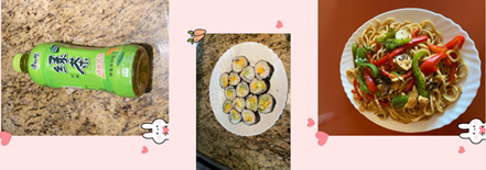 今天的烹饪课有一点不一样。我们今天看了视频还看到老师现场给我们示范和讲解。我们今天做的主食是乌冬面和寿司,然后和买了冰淇淋和绿茶。上课的时候还挺期待下课后自己动手去做乌冬面和寿司毕竟以前还没做过。但是还是觉得有一点简单,下次想看看有没有跟难的。唯一遗憾的是没有全部的食材和调料。下次想尽量把每一个食材都买到。