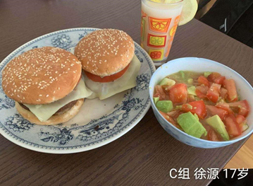 6/8: 今天的烹饪课很精彩,我学会了另外一种做汉堡的做法,老师教的很好,我学的很快,半小时就把素食汉堡,墨西哥酱牛油果拌西红柿,还有柠檬雪碧养乐多,素食肉排味道是真不错,我都还想吃第二次,主要是吃素食可以让我们食堂更健康,然后还可以环保环境