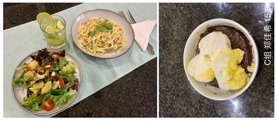 20/8: 今天,我学习了如何制作奶油蘑菇意大利面和巧克力冰淇淋甜点,我已经知道如何制作沙拉。 烧意大利面虽然很有趣,但是,意大利面不适很合我的口味。 巧克力甜点很甜,但是和苦苦的汽水一起配使味道均匀。 这顿饭很完整。 我期待下一堂课能做的饭!