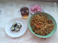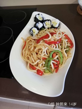 13/8:今天是我们上烹饪课,老师们教我们怎么做素炒乌冬面和寿司。这次老师直接给我们演示了一遍是怎么做。这次的比上次的稍微难一点但是我还是成功的做出来了。最后老师们开始问我们有什么问题大家都一一回答了。