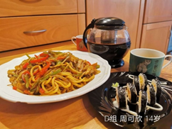 13/8:今天是我们第二次上烹饪课,这是我最喜欢的课程了 又可以学习做饭 又可以吃到美食。这次要做我最喜欢的寿司和素炒乌冬面,这次做的东西要比上次的难的多 老师让我们看了一次视频后 又现场做了一遍,老师最后又带着我们巩固了一遍,提了些问题。下周我们又会做什么美食呢?