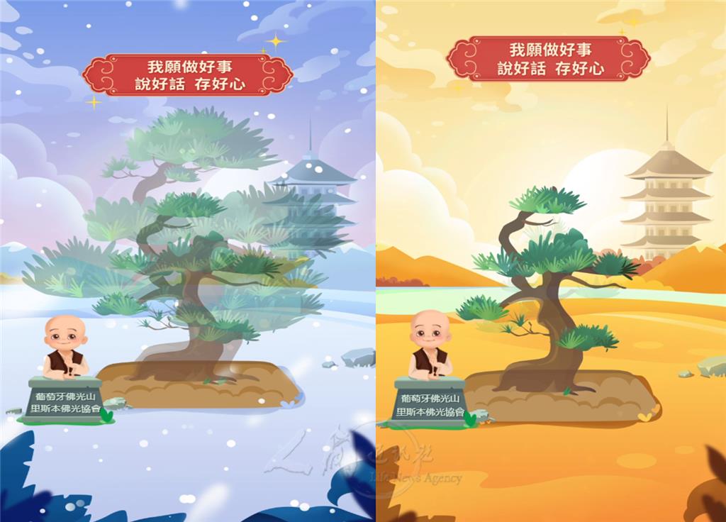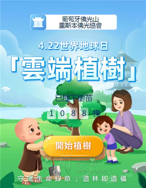 葡萄牙佛光山於4月21日發起「處世無畏‧和平共存‧雲端植樹」活動,廣邀大眾動動手指,在植樹的過程中,發願「我願做好事、我願說好話、我願存好心」,把環保的菩提種子種入心田,讓大家一起把三好理念融入生活中,落實環保救地球,讓法界眾生皆能和平共存。線上推動「環保與心保」,當天逾1088人熱烈上線響應。僧信二眾對APP的設計紛紛表示非常符合大會主題「智慧與創新」、設計得真好,很溫馨的畫面、做得不錯,很有創意。